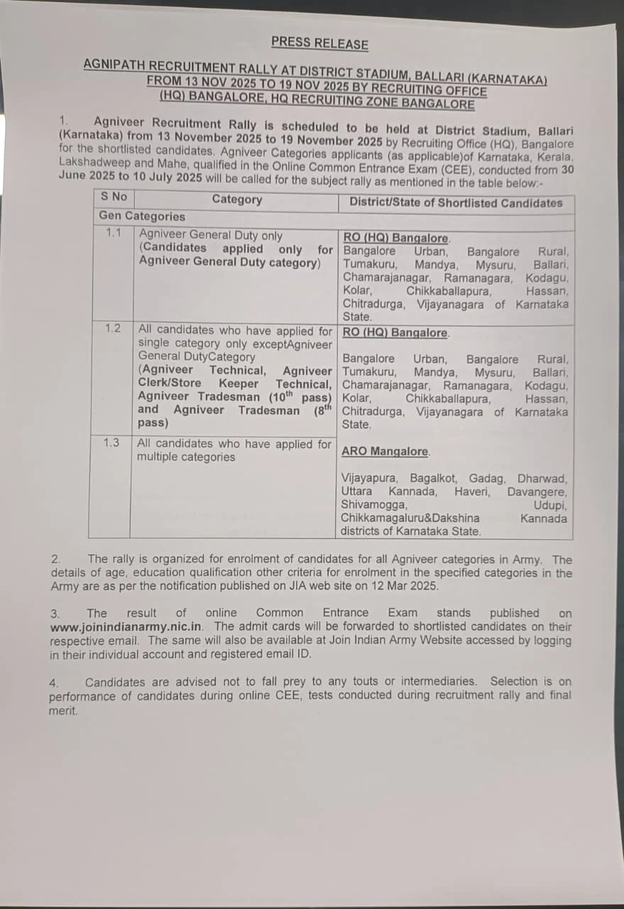 The Indian Army Recruiting Office (HQ) Bangalore, under the HQ Recruiting Zone Bangalore, has announced that the Agnipath Recruitment Rally will be conducted at the District Stadium, Ballari, from November 13 to November 19, 2025. The rally is being organised for shortlisted candidates from Karnataka, Kerala, Lakshadweep, and Mahe who have qualified in the Online Common Entrance Exam (CEE) held between June 30 and July 10, 2025.