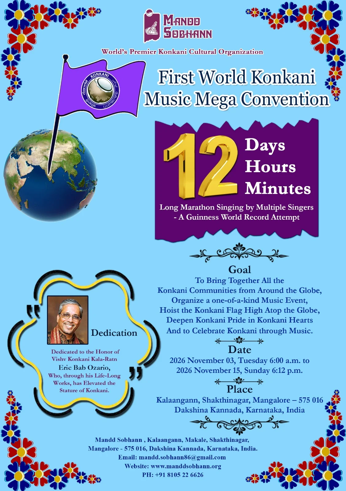 The event is expected to involve over 5,400 singers performing 5,400 Konkani songs. The record attempt will be dedicated to the memory of the late Eric Ozario, whose lifelong contributions significantly enriched the Konkani language and music tradition.