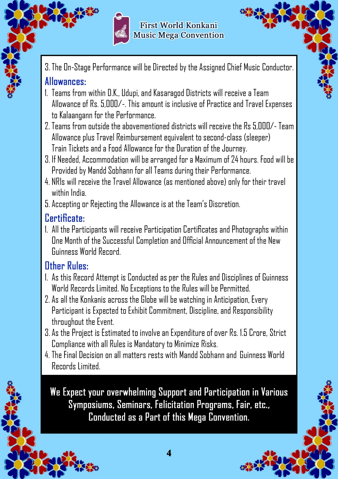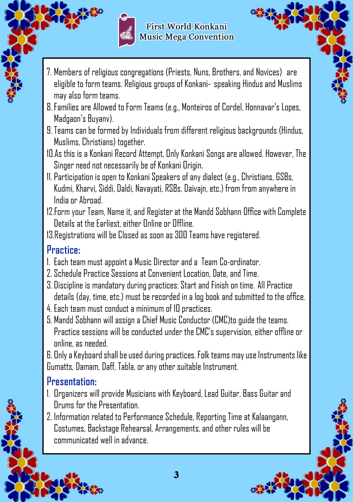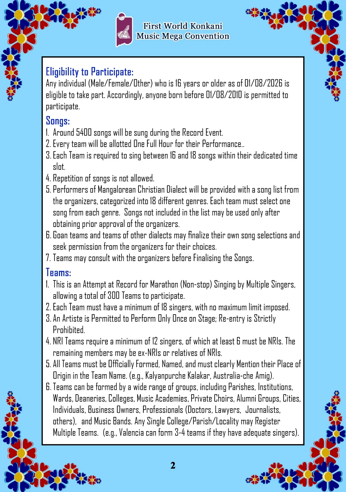 Participation is open to singers of any linguistic background, provided that all songs performed are exclusively in Konkani. Individuals representing all Konkani dialects — Hindu, Muslim and Christian — from across India and abroad are invited to take part.