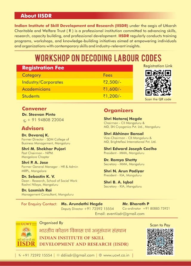 The Indian Institute of Skill Development and Research (IISDR), under the aegis of Utkarsh Charitable and Welfare Trust (R), is organising a one-day workshop titled “Decoding Labour Codes – Understanding the New Era of Labour Reforms in India” on Saturday, December 20, 2025, from 8.30 am to 6.00 pm at the Dr. TMA Pai International Convention Centre, Mangaluru. The workshop is being organised partnering with Confederation of Indian Industry (CII), Mangaluru, Mangalore Management Association (MMA), and Kanara Industries Association (KIA).