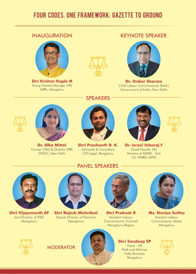 Shri Krishna Hegde M., Group General Manager at MRPL, will inaugurate the workshop.                      Sub Lieutenant Abhay Udupa, will be the Guest of Honour during the inaugural programme and will be felicitated in recognition of his appointment as Sub Lieutenant at Indian Navy. The programme features an eminent panel of speakers including Dr. Onkar Sharma, Chief Labour Commissioner (Retd.), Government of India, Dr. Alka Mittal, Former CMD and Director (HR), ONGC, New Delhi, Dr. Israel Inbaraj F, Guest Faculty, IIM, Shri Prashanth B. K., Advocate and Consultant, CCI Legal, Bengaluru, Shri Rajesh Mishrikoti, Deputy Director of Factories, Mangaluru, and other local Statutory Authorities. Industry perspectives will be shared by Shri Sandeep S. P., Head – HR, Pratt & Whitney India Business, Bengaluru during the panel discussion.