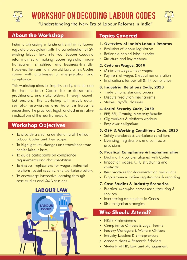 India is witnessing a landmark transformation in its labour regulatory framework with the consolidation of 29 existing labour laws into four Labour Codes covering wages, industrial relations, social security, and occupational safety, health and working conditions. While these reforms aim to simplify compliance and make labour laws more transparent and business-friendly, they also pose significant challenges in interpretation and implementation. The workshop is designed to bridge this gap by decoding complex legal provisions and translating them into practical, actionable insights for organisations and professionals.