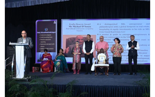The Kudla Beacon Award, symbolising fire as a force of light, hope and continuity, was awarded to Mr. Michael D’Souza for his global enterprise, empathy-driven philanthropy and sustained social impact. In his address, Mr. D’Souza humbly acknowledged the Almighty for granting him the ability to generate wealth and the generosity to share it with those in need. He reflected that he sees himself only as a custodian with a responsibility to give back. Emphasising the importance of recognising good work, he noted that visibility creates momentum, and momentum creates more good, while also commending the institution for its long-standing service-oriented mission.