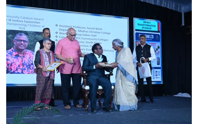 The Community Catalyst Award was presented to Dr. N. Joshua Jayaseelan for his unwavering commitment to championing children at risk. Accepting the honour, Dr. Jayaseelan shared that his journey in social work began in slum communities, where he learned the interconnected realities of poverty, dignity, faith and education. He identified education, faith and community action as the three pillars that continue to guide his life and work.