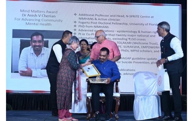The Mind Matters Award was conferred on Dr. Anish V. Cherian for his contributions to mental health advocacy and community-based interventions. Dr. Cherian shared that social work has always been an integral part of his life and reflected on the lack of access to mental health services at the community level. He spoke about beginning his work within communities, particularly in the area of suicide prevention, and stressed the urgent need to normalise conversations around mental health. He reminded the audience that the world needs empathy and collective support, calling for greater awareness and action in suicide prevention.